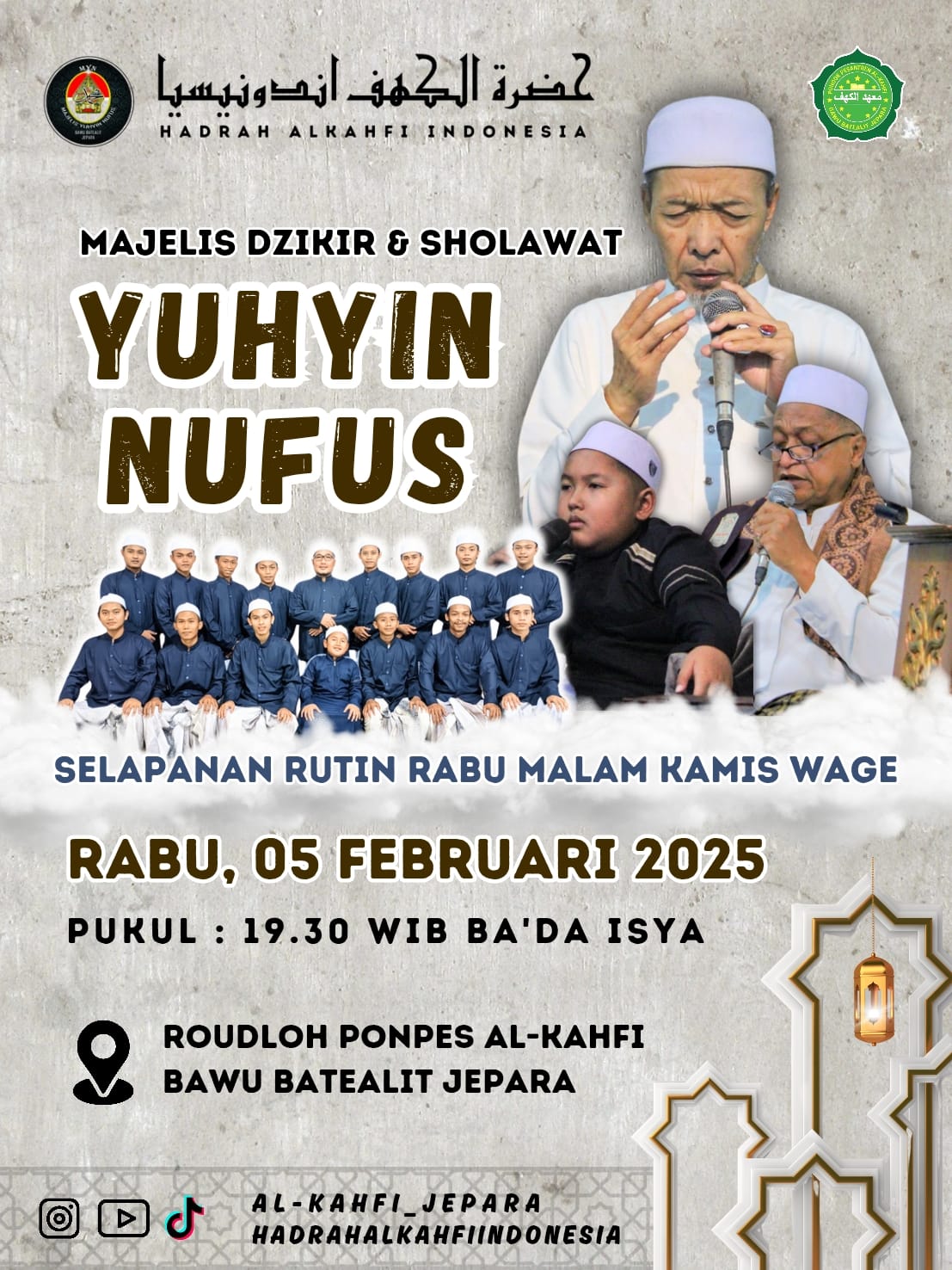 Jepara, 05 Februari 2025 — Yayasan Pondok Pesantren Al Kahfi Mojo yang diasuh oleh Drs. KH. Ali Mudhoffar Al-Hafidz kembali menggelar majelis dzikir dan sholawat rutin bernama Yuhyin Nufus. Kegiatan yang diselenggarakan setiap malam Kamis Wage ini akan berlangsung pada Rabu malam (05 Februari 2025) selepas salat Isya, pukul 19.30 WIB, bertempat di Roudhoh Al Kahfi.